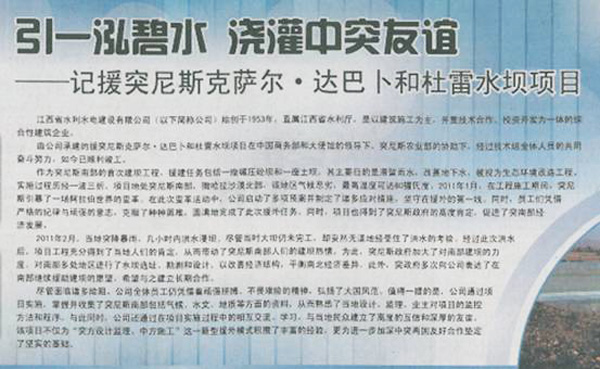 由公司承建的援突尼斯克薩爾?達(dá)巴卜和杜雷水壩項(xiàng)目在中國(guó)商務(wù)部和大使館的領(lǐng)導(dǎo)下、突尼斯農(nóng)業(yè)部的協(xié)助下,經(jīng)過(guò)技術(shù)組全體人員的共同奮斗努力,如今已順利竣工。